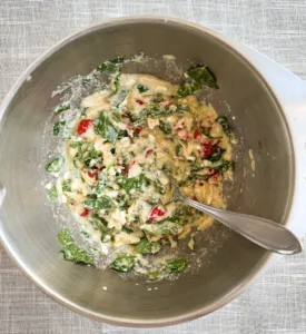 Now fold the veggies and the cheese into the flour mixture. Give it a good mix and then add the wet ingredients and mix again until everything is well combined.