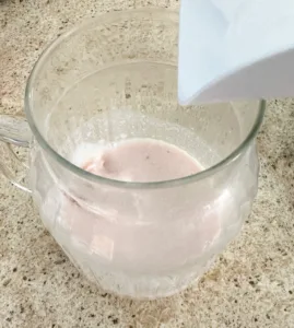 In your glass, add the strawberry syrup and the milk together. Give the strawberry syrup and milk a good mix until you get a soft pink color and they are completely integrated together.