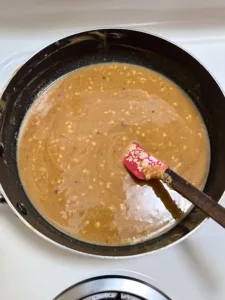 Begin by melting peanut butter, maple syrup, and coconut oil in a sauce pan over low heat until smooth. Then, add in the vanilla extract and salt.