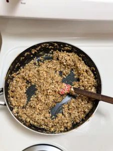 - Next in a separate bowl, mix together the oats, shredded coconut, and chia seeds. Then add the oat mixture to the peanut butter mixture in the sauce pan and mix everything together well.