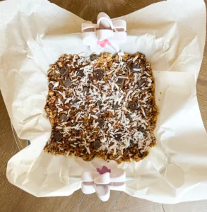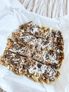 Coconut oil- Gives the granola bars chewiness and a good texture. Also, coconut oil adds to the coconut taste of the granola bars.
