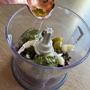 In this recipe I use two types of olives, kalamata and green olives, capers, avocado or olive oil, garlic, lemon juice, and herbs. I’ll explain the ingredients more in depth later in this article.